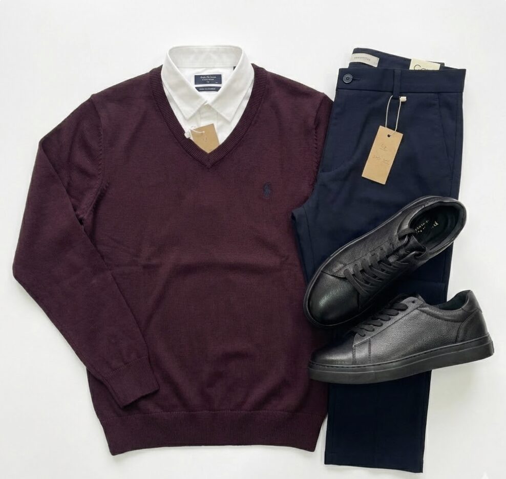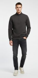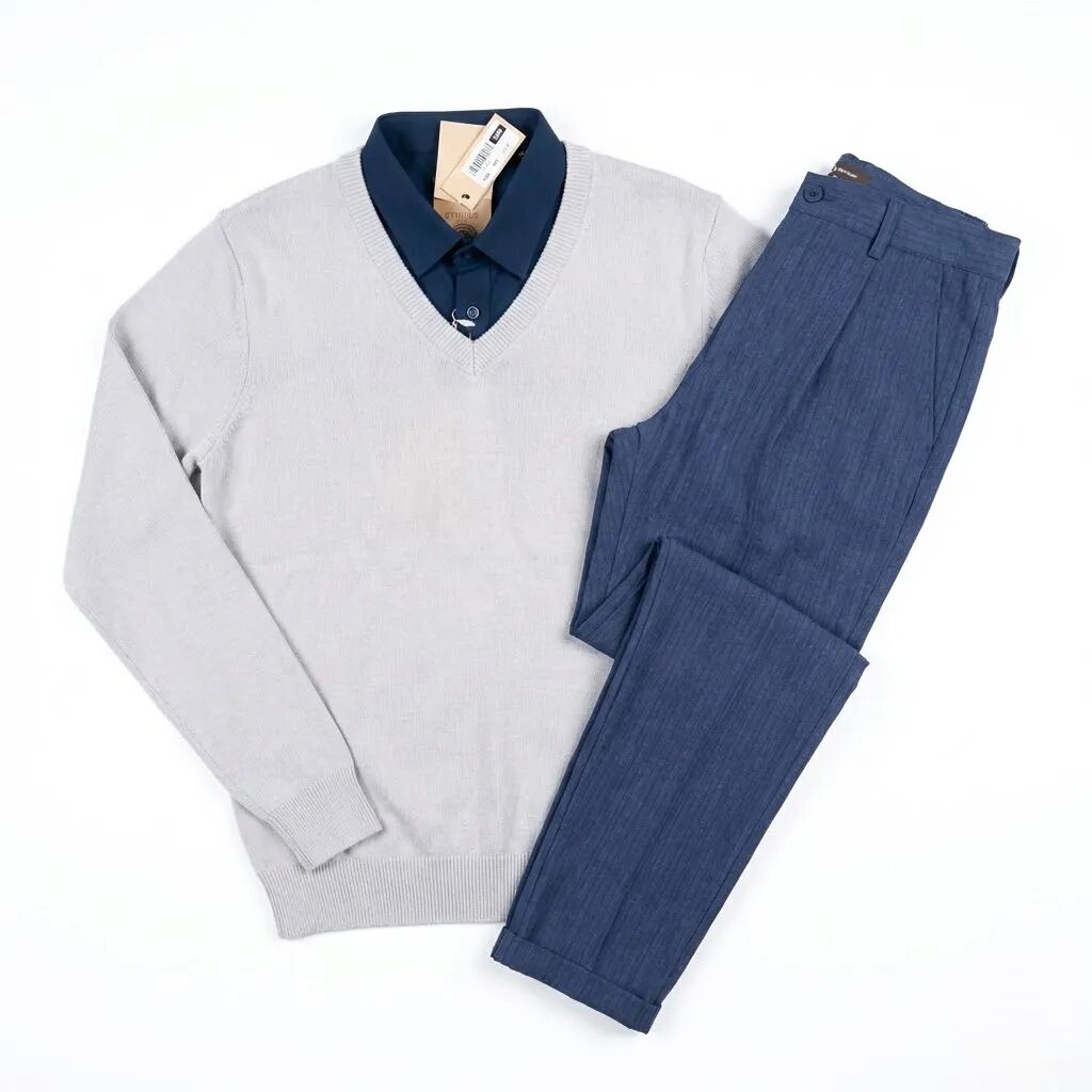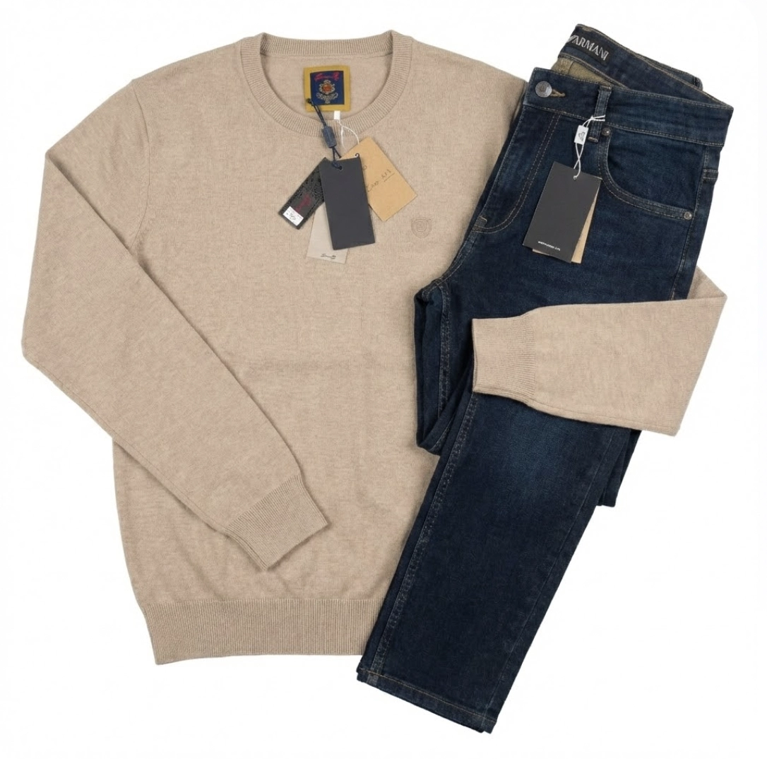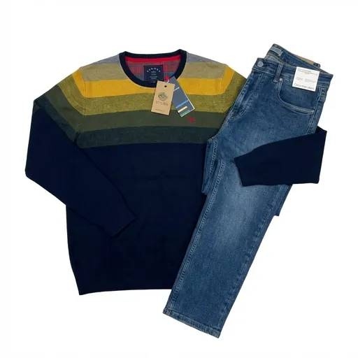 ست کژوال پلیور بافت یقه گرد طرح راه راه افقی سرمهای و خردلی با ترکیب رنگ سبز و طوسی به همراه شلوار جین آبی کلاسیک