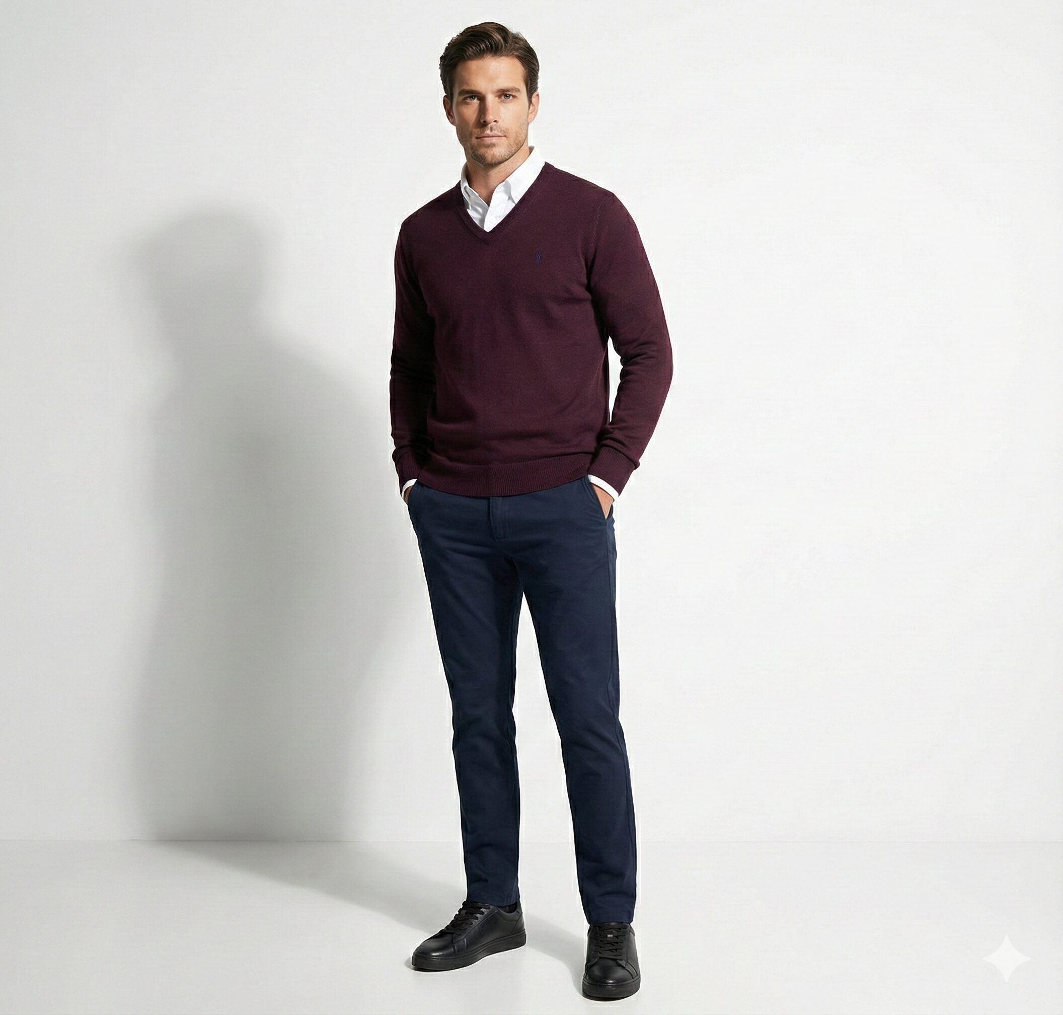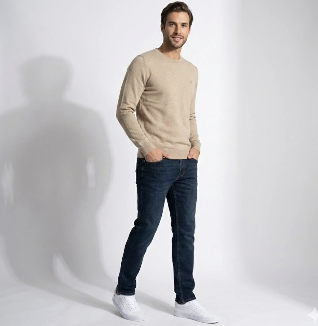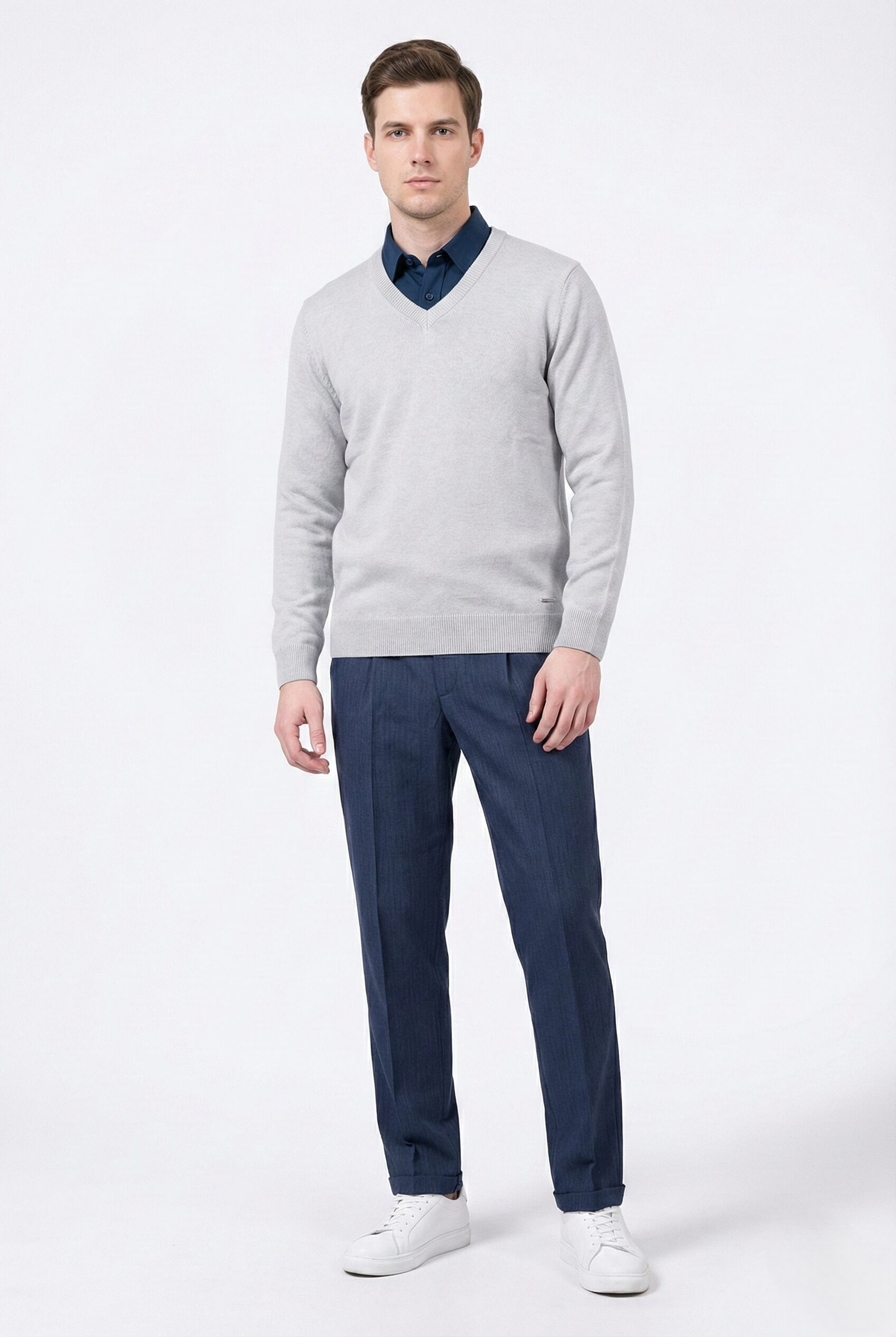 ست کژوال پلیور بافت یقه گرد طرح راه راه افقی سرمهای و خردلی با ترکیب رنگ سبز و طوسی به همراه شلوار جین آبی کلاسیک